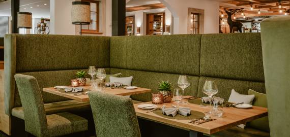 Gedeckte Tische im Restaurant des Resort Bergkristall
