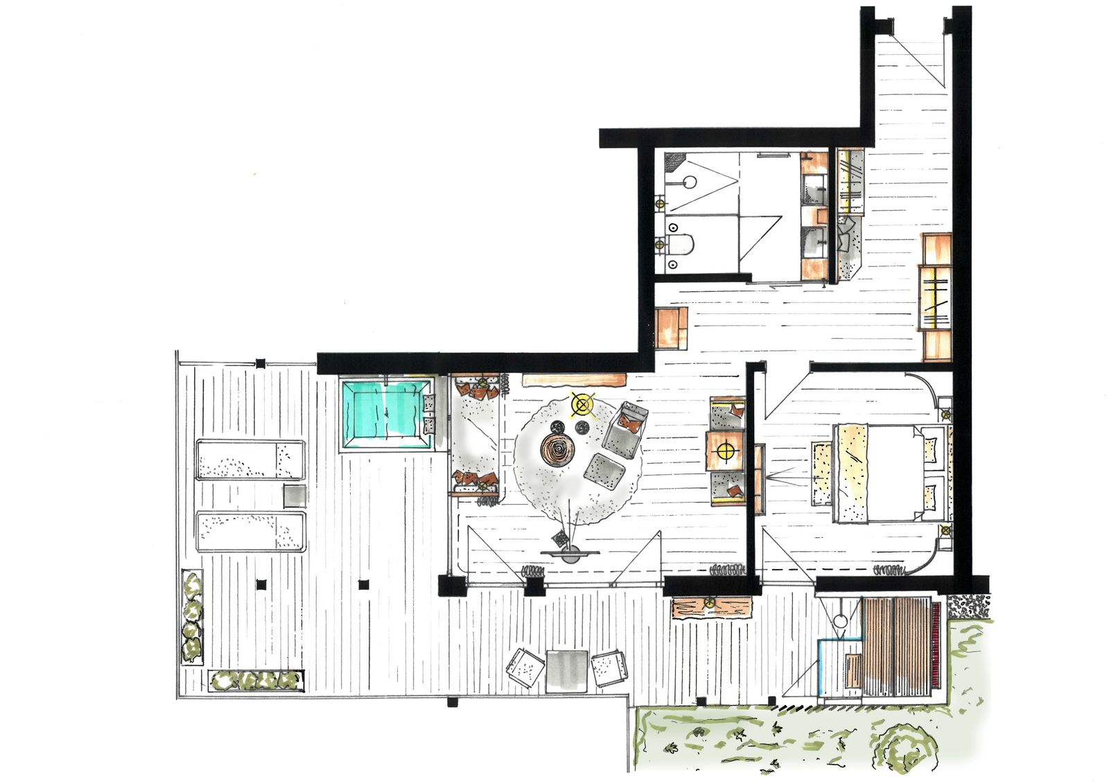 - Private terrace with whirlpool tub, Finnish sauna, outdoor shower and comfortable loungers