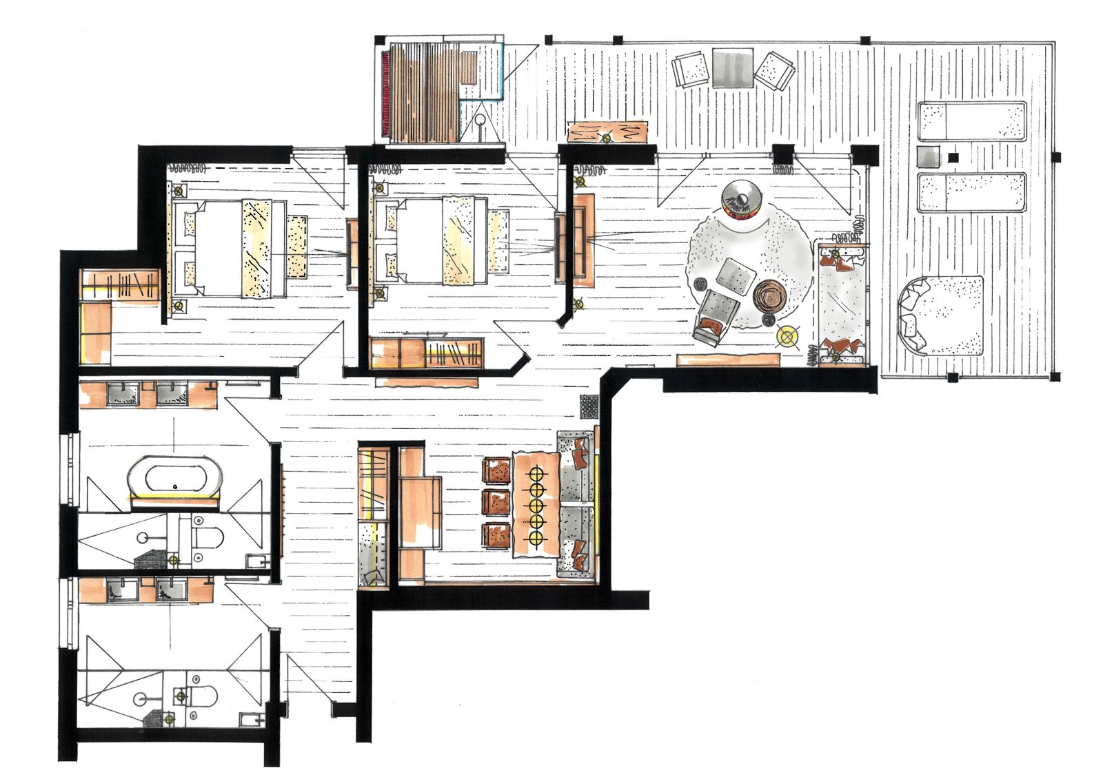 - Spacious balcony with outdoor sauna and shower, comfortable loungers and seating area