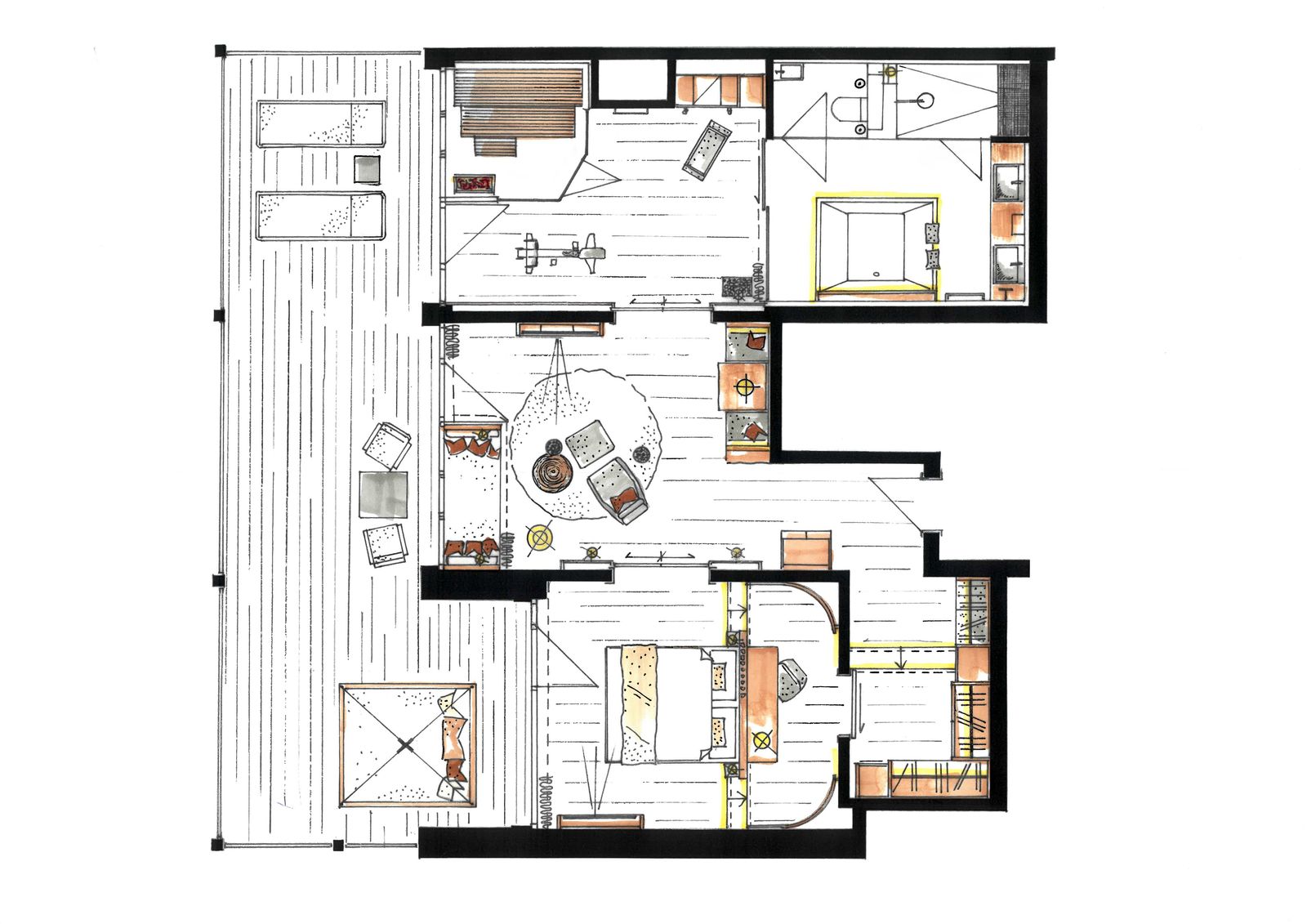 - Roof terrace with free-floating suspended bed, loungers and seating area